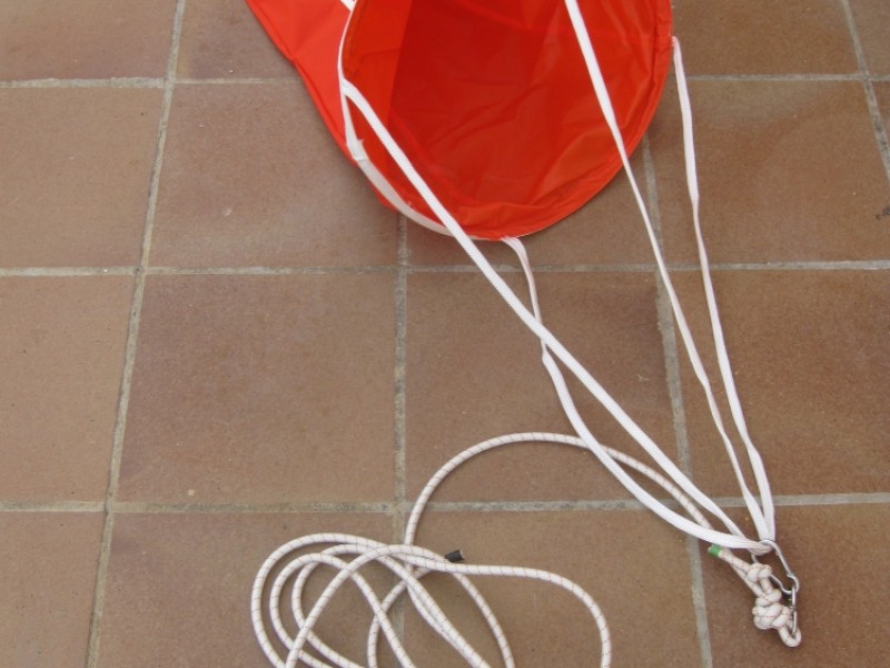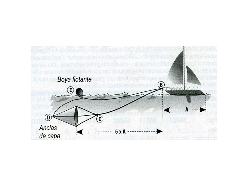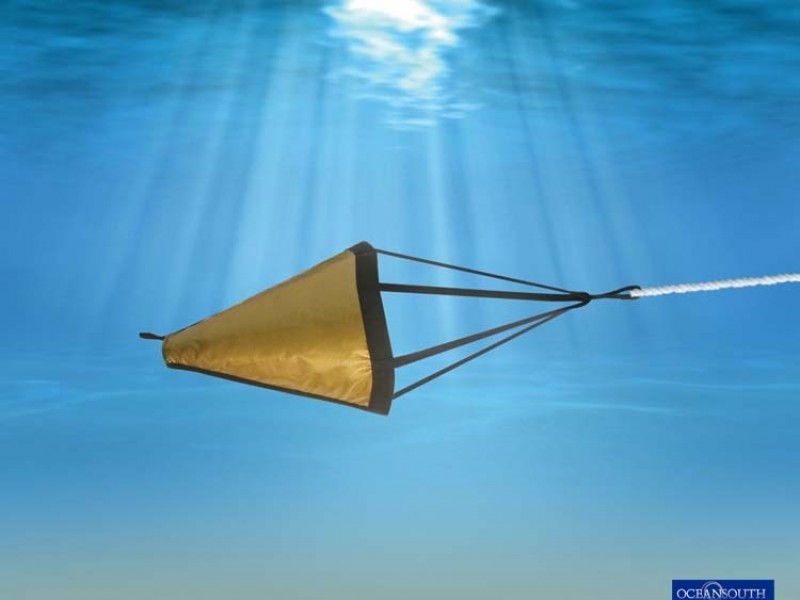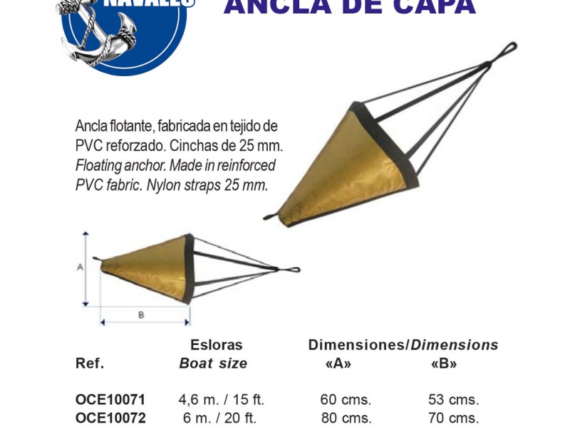 Ancla de Capa para uso en el pack SOLAS de las balsas salvavidas, y ademas como elemento de ayuda para mover embarcaciones livianas, yates cuando no hay viento, o salir de lugar de dificil fondeo. Articulo de lanzamiento y recogida, permite capturar agua al remolque , para guiar posicion del yate o embarcacion.