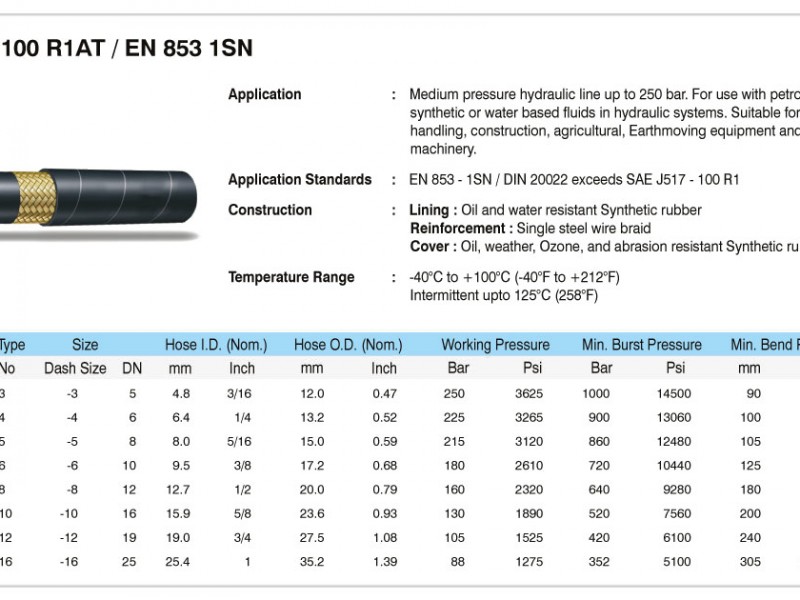 SAE100 R1 AT Manguera hidráulica SAE 100 R1AT / EN 853 1 SN Línea hidráulica de media presión hasta 250 bar. Para uso con petróleo, petróleo o agua a base de sistemas hidráulicos. estándares de aplicación: En 853/1 SN / DIN 20022 excede SAE J517 - R100 R1. CONSTRUCCIÓN: Revestimiento: caucho sintético resistente al aceite y al agua. Descripcion: DN: 8 Diámetro interior de la manguera: 8.0 mm. Diámetro de la manguera exterior: 15.0 mm. Presión de trabajo: 215 BAR Presión de explosión mínima: 860 BAR o 12.480 psi Presión de curva mínima : 105 mm o 4,2 pulgadas Norma ISo 9001, producido en China