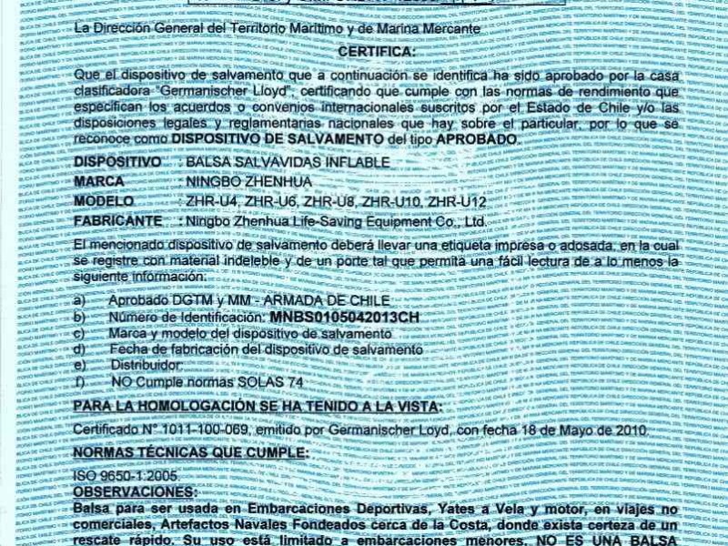 Certificación balsas salvavidas, requerimiento obligatorio para autorizacion de revista anual de las embarcaciones en le Republica de Chile. Otorgada ante inspeccion de personal calificado y aprobado, talleres de inspeccion , que efectuan prueba real en seco, de la unidad y certifican su estandar de calidad, y revisan los pack de sobrevivencia, que puede ser Pack A solas; Pack B solas; Pack B costero; Pack ISO 9650-1. Para certificar una balsa salvavidas, se solicitara al comprador : Nombre del dueño o armador; Nombre de la embarcacion o Yate; Matricula vigente; Puerto Base; la que se realiza en un plazo promedio de 5 dias habiles, ya que requiere coordinacion con autoridad maritima. El valor indicado, es para certificacion, vigente por 12 meses, ya que la balsa salvavidas es de revision anual, en la ciudad de Puerto Montt, previa coordinacion entre Aquanet y el comprador.