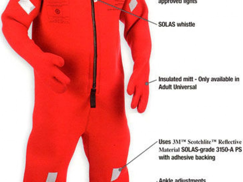 Botines integrados del mismo material que el resto del traje, suela para pisar cuando se llegue a tierra firme, para no perder la asilacion. SOLAS aprobado |